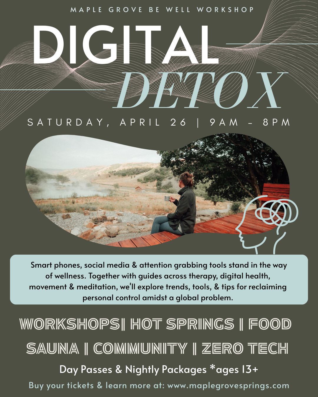 Digital Detox - A Be Well Workshop Join us on Sat April 26th as we explore how to cultivate Digital Wellness in our personal, professional, and family lives. Do we understand the problems it creates? Do we have a community of resources to support healthy boundaries and practices? Are we raising a younger generation that is prepared to design a sustainable path towards digital wellness? In this inaugural one-day workshop, you'll join a diverse community of adults, youth, professionals, parents, and curious rebels in an immersive day exploring the epidemic of digital un-wellness alongside experts, therapists, and students of digital health. Day only and nightly packages available. |