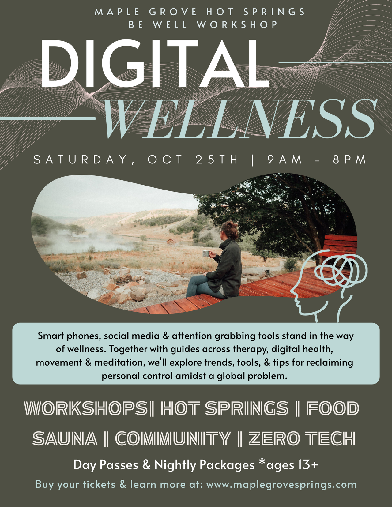 Digital Detox - A Be Well Workshop Join us on Sat, Oct 25th as we explore how to cultivate Digital Wellness in our personal, professional, and family lives. Perhaps more than ever before, society is confronted with a choice that, for better or worse, falls into the hands of nearly ever individual to make. Can we regain control of our digital lives? From phones to forums to social media and the daily distractions of digital noise, are we aware of how unwell we are? Do we understand the problems it creates? Do we have a community of resources to support healthy boundaries and practices? Are we raising a younger generation that is prepared to design a sustainable path towards digital wellness? In this one-day workshop, you'll join a diverse community of adults, youth, professionals, parents, and curious rebels in an immersive day exploring the epidemic of digital un-wellness alongside experts, therapists, and students of digital health. Day only and nightly packages available. |
